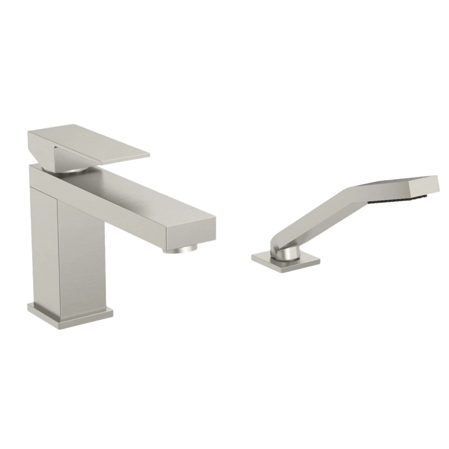 2-piece deck mount tub filler with hand shower. Tub spout with integrated push-summary diverter