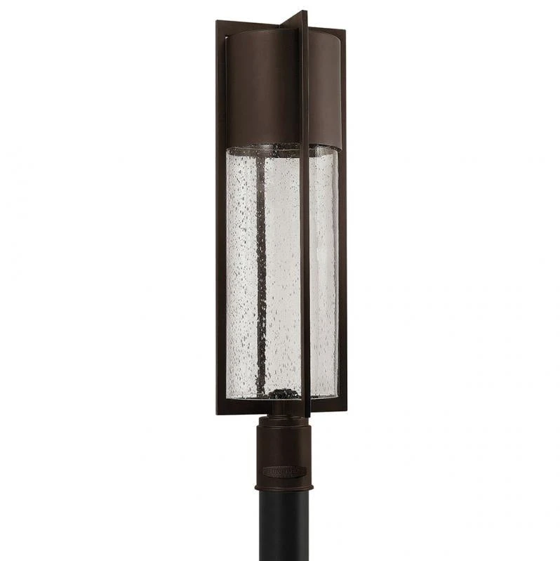Shelter’s minimalist style in aluminum creates a chic, dramatic statement as the light from above grazes through its clear seedy glass. Shelter comes standard Dark Sky compliant.